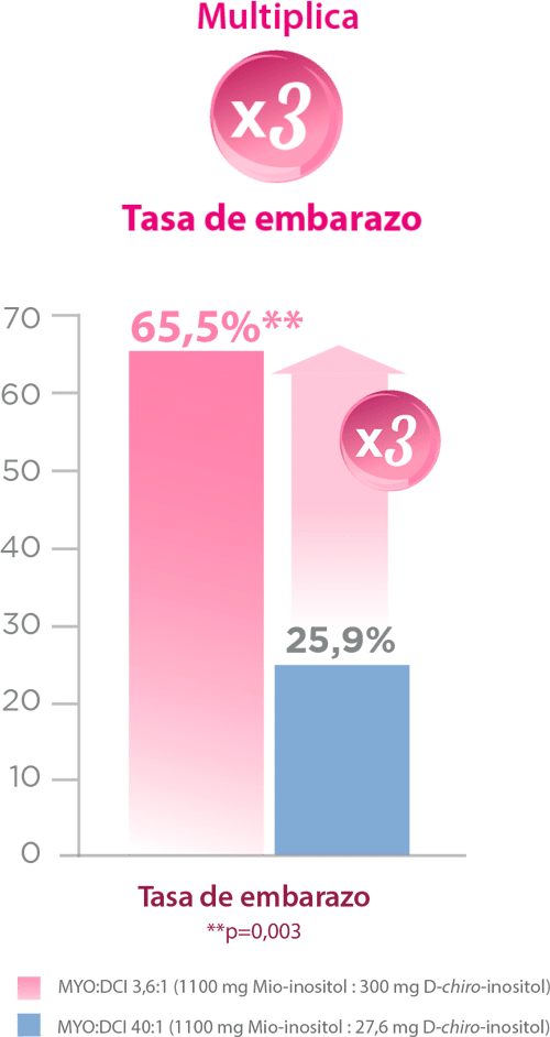 Combinación exclusiva de inositoles que incluye Mioinositol y D-chiroinositol en unas cantidades específicas únicas en el mercado. Estas cantidades están basadas en ensayos clínicos que han demostrado su eficacia en la mejora de la fertilidad y la tasa de embarazo.